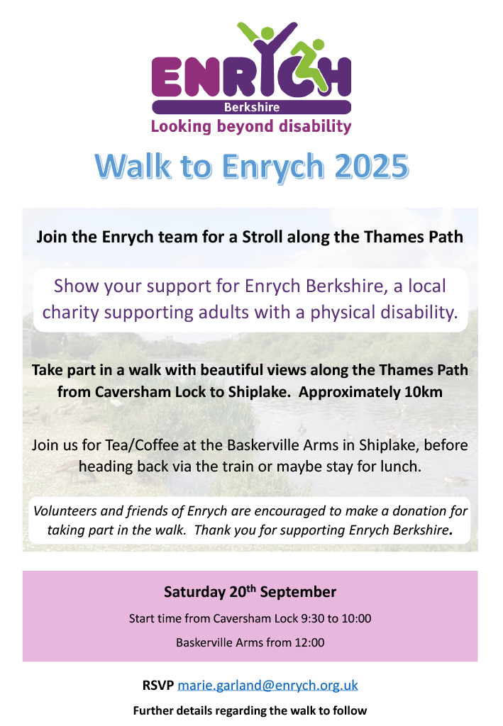 Experience the beautiful views whilst supporting Enrych Berkshire. Donations for taking part in the leisurely walk are appreciated, these can be made via our Local Giving Page: https://localgiving.org/donation/enrychberkshire/start